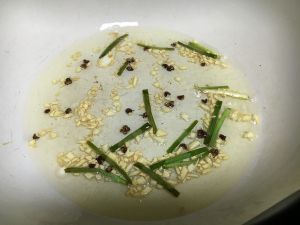 锅内倒入油烧至5、6成,放入葱段、花椒和部分蒜末,炒香,