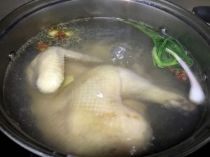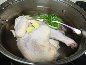 鸡肉洗净,汤锅接满清水至没过鸡肉,放入姜片、葱结和花椒,开大火烧开