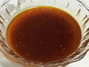 红油中放入蒜末、生抽、醋、盐、味精、糖、香油、花椒粉和鸡汤,拌匀放凉