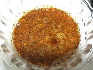 将热油倒入盛放辣椒粉的碗中,稍微搅拌