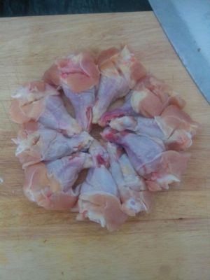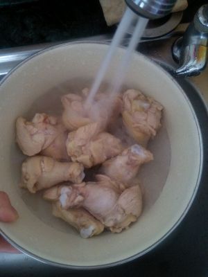 鸡翅(拿鸡腿代替了)洗净,改刀(正反面切三刀)然后放在大碗里,加料酒、盐腌制10分钟