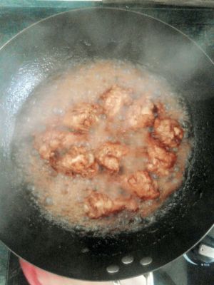 腌制好 葱姜炝锅 鸡翅入锅 翻炒一下 加百事可乐 其实具体放多少还是看你能否吃甜 如果只是想有些甜味 200ml也就够了 不然就直接一听下去 中间小心点会溅手上……不要问我为什么知道(╥﹏╥) 然后就是加一些老抽提色 但是一勺其实没怎么显色 反倒如果真想不用老抽提色 可以入锅开始就用冰糖熬粘 提色效果很好……言归正传 然后就是慢慢熬了 制作途中得图~热气腾腾