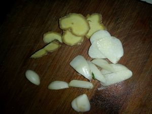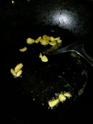 热锅后放2勺油,姜片和蒜头,干辣椒,炸出香味。