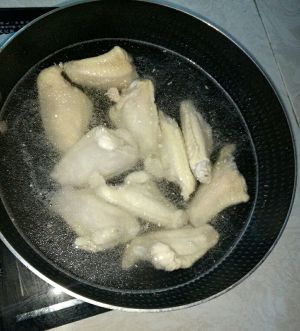 鸡翅洗净在两边划两刀。锅里煮开水,放鸡翅下锅煮两分钟去血水。煮好捞起。