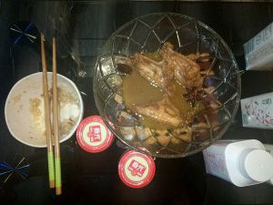 用家中普通的碟子,盛浅浅两碟子百事可乐,倒入锅中,(莫过鸡翅即可)。盖锅盖开始大火焖煮。