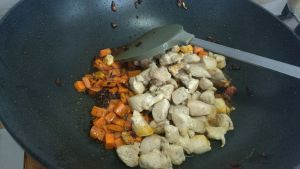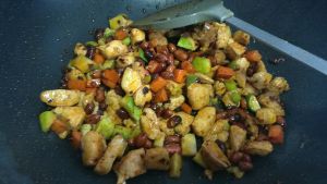 1锅中倒入适量油 ,腌渍好的鸡肉入锅翻炒至六七成熟 ,加入备用的戳水的蔬菜丁翻炒 ,倒入调好的佐料翻炒,加入一勺本菜必备调料:郫县豆瓣酱 (基本熟了),出锅前把花生撒入 ,尝下味道,根据喜好添加调料比例,爱酸就多醋咯!,出锅!