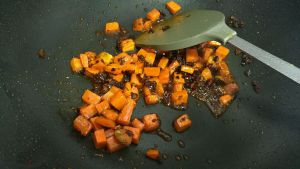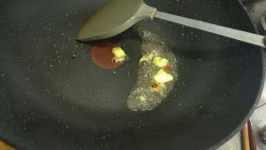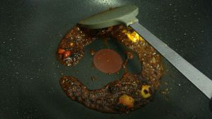 香味出来后,再放入郫县豆瓣酱爆炒,家里没有郫县豆瓣酱了,放老干妈辣酱没有出红油的效果。