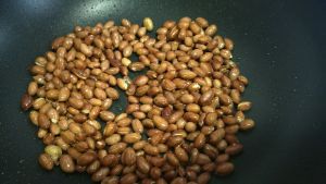 将花生用热水泡一下这样方便去皮 ,将去皮花生放入碗里用厨房纸吸干水放一边,