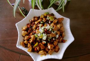 锅里从新放油将花椒、豆瓣酱、糍粑辣椒放入锅中炒出香味放入大蒜和姜丝,将鸡丁、花生、辣椒丝倒入锅中炒到鸡丁熟后勾芡,放入芝麻起锅装盘撒上葱花,就OK了。