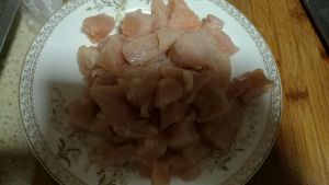 鸡胸肉切小块,应该再小点,放料酒,胡椒粉腌制20分钟。。