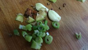调一碗佐料,酱油1勺+料酒2勺+糖1勺+醋一勺,+蒜瓣和香葱适量,备用