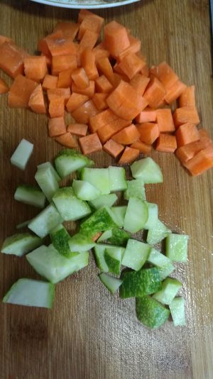 鸡肉切同样大小丁,用水淀粉和鸡蛋腌渍20分钟。可稍许倒入一点点料酒。