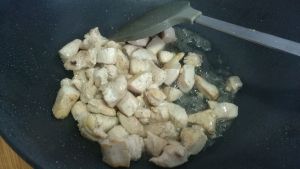 腌制好的鸡肉块裹上蛋清后再放油锅里翻炒变色,六成熟就可以。