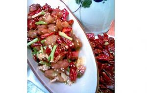 煸花椒和干辣椒(辣椒和花椒可以随自己的口味添加,不过为了体现这道菜的特色,做好的成品最好是辣椒能全部把鸡盖住,而不是鸡块中零零星星出现几个辣椒和花椒),翻炒至气味开始呛鼻并且不停的咳嗽,再倒入葱,姜,蒜,炒出香味后放入鸡块,再调口时放点芝麻,香辣油和香油,炒匀后即可。