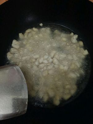 腌制的肉,临下锅前抓上淀粉。宽油,待油热导入鸡丁,快速翻炒。注意:鸡肉外部变成白色,感觉里面还有点泛粉红,就盛出来,这样大概6-7成熟。