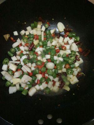 时间差不多后,加入多一点盐(可尝一下),味精,鸡粉,和七星街段。然后再煮一会儿,这时千万不能盖锅盖(否则青椒要变黄),青椒的颜色鲜绿才好看