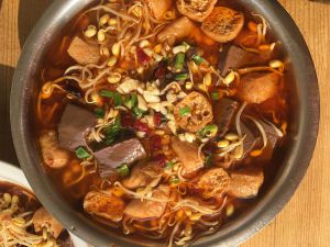 牛杂焖软后继续加入莲藕、金针菇和猪血煮开以后再煮多五分钟,加入白砂糖,适量盐调味