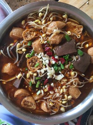 加入豆芽,炒熟,倒入适量水,约250毫升加入鸭血,土豆,金针菇,等一些蔬菜,口味重的可以再加入盐,鸡精,辣椒粉。煮熟撒上香菜熟芝麻跟花生跟花椒
