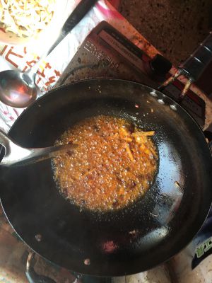 爆炒到有香味、放少量料酒、醋、生抽、老抽、盐调味