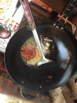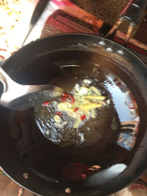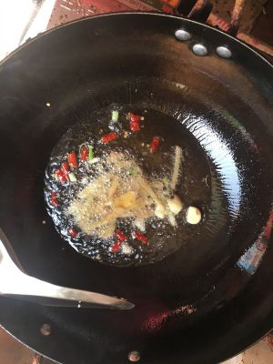 大葱三分之一根,蒜瓣六七片,生姜三片,干辣椒十个,老干妈豆瓣辣酱适量,锅里倒油炒香