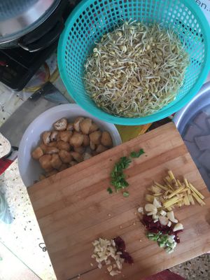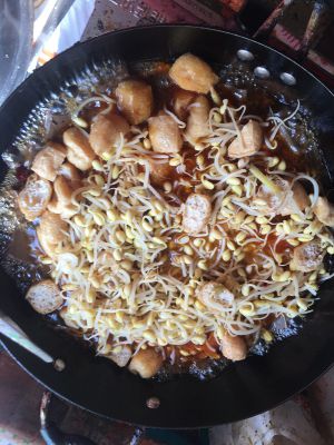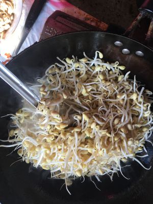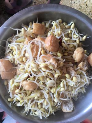再放入刚刚炒好的备用的豆芽和油豆腐一起煮、煮熟装盘