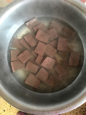 捞起牛杂之后,在水里加点白醋,放入猪血焯水,水开之后煮多五分钟捞出备用