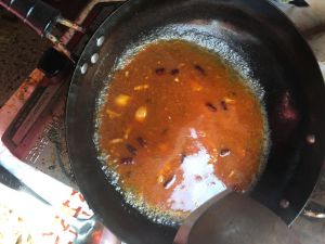 锅烧热倒入油放入另外一份干辣椒,花椒炒香,