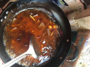 放入一勺辣椒酱、爆炒到有香味、放少量料酒、醋、生抽、老抽、盐调味