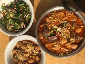 捞起杂菜之后,在水里加入料酒和生姜,放入牛百叶等牛杂煮熟捞出备用