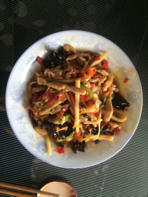 然后加入胡萝卜、木耳、尖椒、冬笋,葱末,倒入鱼香汁,稍炒一会儿即可出锅。PS:图片有点不全,下次努力弄得好一点哈