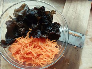 准备材料: 木耳,萝卜切丝【我是用工具来把它擦成丝的,用手切容易切太粗】 饭店里会放些笋,自家做放不放都ok