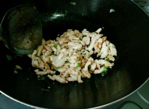 锅中倒比平时炒菜多一点点的油,六成热的时候把肉丝放进去,炒到肉丝变白时倒入蒜末、姜末、剁椒,炒两三分钟