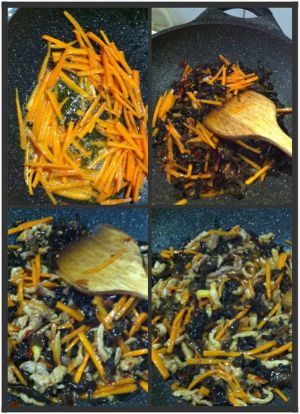 起火,将姜沫,蒜沫,葱沫炒至出香味,加入胡萝卜,水发木耳,再加入猪肉,大火炒,最后加入酱汁,出锅。