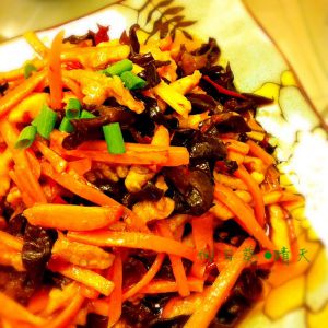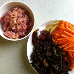 把猪肉切成条状,加入2.5勺水淀粉,盐,腌制20分钟。将胡萝卜切成丝,木耳切开。姜,蒜,葱切成沫。