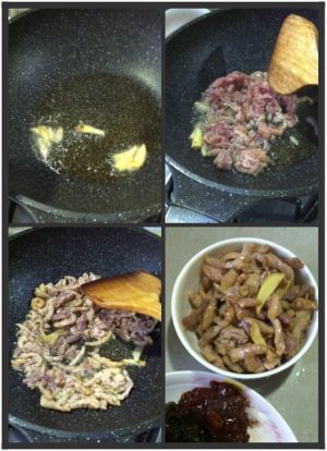 锅中倒适量植物油烧8层热,下姜丝爆香,再下肉丝爆炒至7层熟,沥油捞出备用。