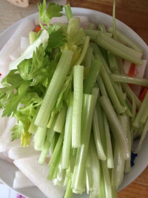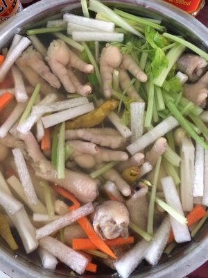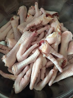 把鸡脚捞起,过一遍冷水(为了让鸡脚更有弹性)。重新往锅里煮开一锅水,把鸡脚再煮10分钟。