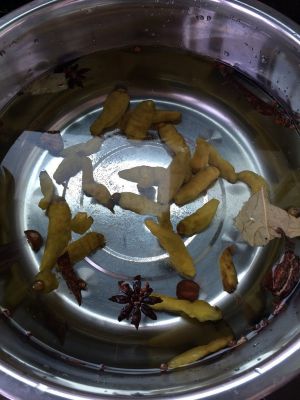 我吧鸡爪切成两段用水泡了一会把里面的血水泡了出来然后在把佐料放在锅中与鸡爪一起煮沸,然后在煮10分钟