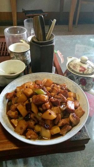 依次下入鸡块和土豆 倒入兌好的汁 倒点水 小火炖至土豆软即可 别忘撒盐呀!