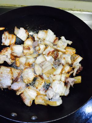 油锅烧热 放蒜姜 放入肉片煎至焦黄