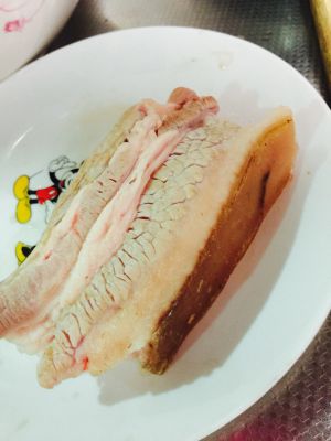 五花肉冷水下锅,煮八分熟,捞出放入冷水盆,切薄片,