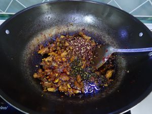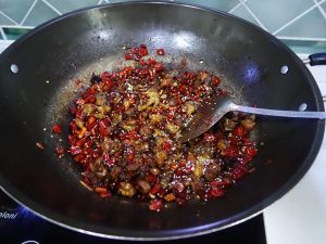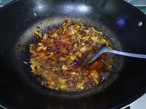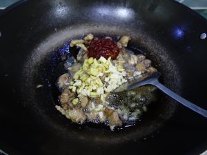 是时候加调料了。首先要加的是豆瓣酱和姜蒜,加完之后持续翻炒。