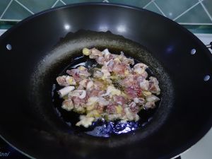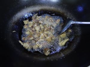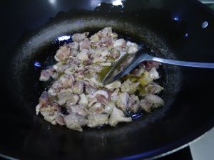 继续翻炒5、6分钟,直至鸡皮收缩,颜色焦黄。