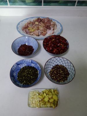 嫩土鸡斩成小块,加少量盐和料酒腌一会儿。干辣椒剪成小段,生姜大蒜随意切碎,豆瓣酱、花椒、藤椒准备好。