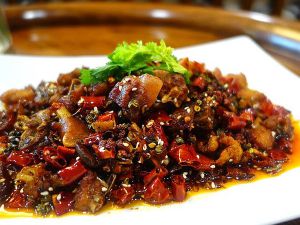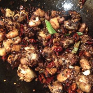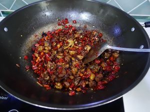 撒入花椒和藤椒,继续煸炒。边炒边多讲两句,我在炒之前揉少量盐将鸡肉腌一会儿,所以在炒制过程中就没有放酱油了。因为我觉得这样炒,鸡肉更入味而且颜色不至于过分深沉。辣子鸡因为炒制的时间比较持久,加之豆瓣的辅佐,不加酱油的颜色是刚刚好的。
