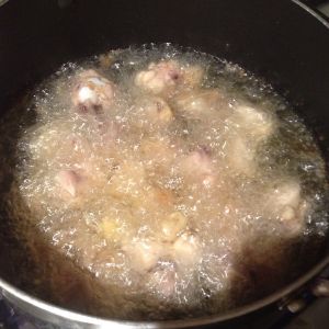 将所有炸好的鸡块再次放入油中复炸。炸制金黄。