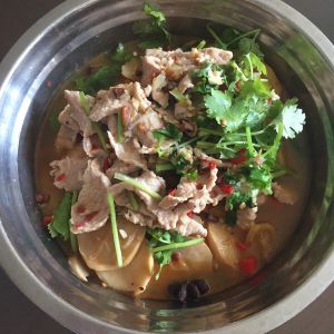 汤汁煮开以后烧煮3到5分钟这样汤味会更浓,然后将码好味的肉片一片一片的放入汤里,然后用筷子将肉片划散开避免肉片粘仔一起影响肉的口感,待肉片颜色变成白色关火,将肉片及整锅汤汁倒入装有素菜的盆里。