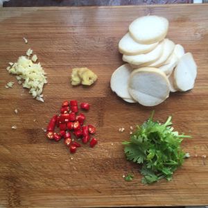 把杏鲍菇切片 小辣椒切粒 蒜头也切粒 姜切片 最后切一点香菜