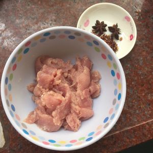 将瘦肉切成约5厘米长、2.5;厘米宽、0.3厘米厚的大薄片(只是大概,不用严格衡量,总之薄一些会比较好),如果觉得不好切,可以将肉放入冷冻室稍冻,待肉有些硬时切片,用淀粉、料酒、盐和少量水将肉抓匀稍腌待用。