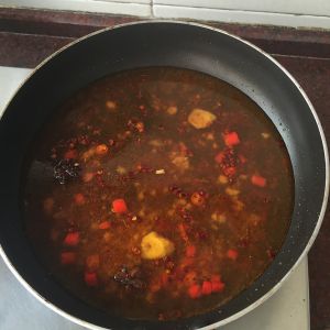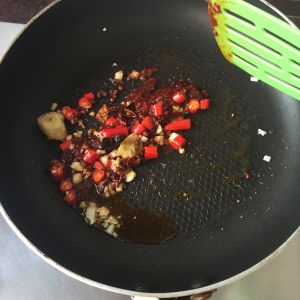 锅里倒油,待油温七八成热时将花椒、葱姜蒜一起下到锅里,将香味炒出再放两勺郫县豆瓣,加以炒香后加水。