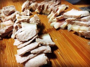 五花肉要选宽一些的,冷水下锅煮,水中放花椒、姜片、料酒一小碗,水开后煮8分钟,肉煮至八成熟即可。